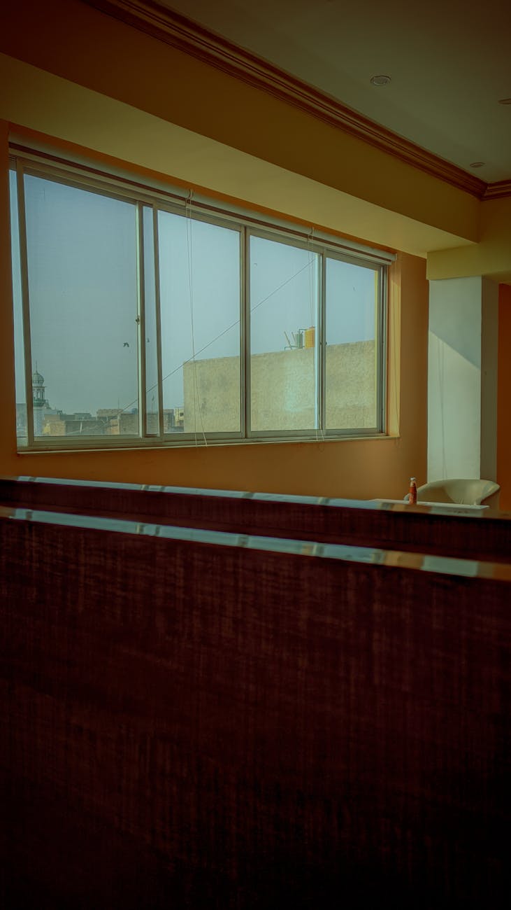 A serene, modern interior space with large windows and soft lighting.